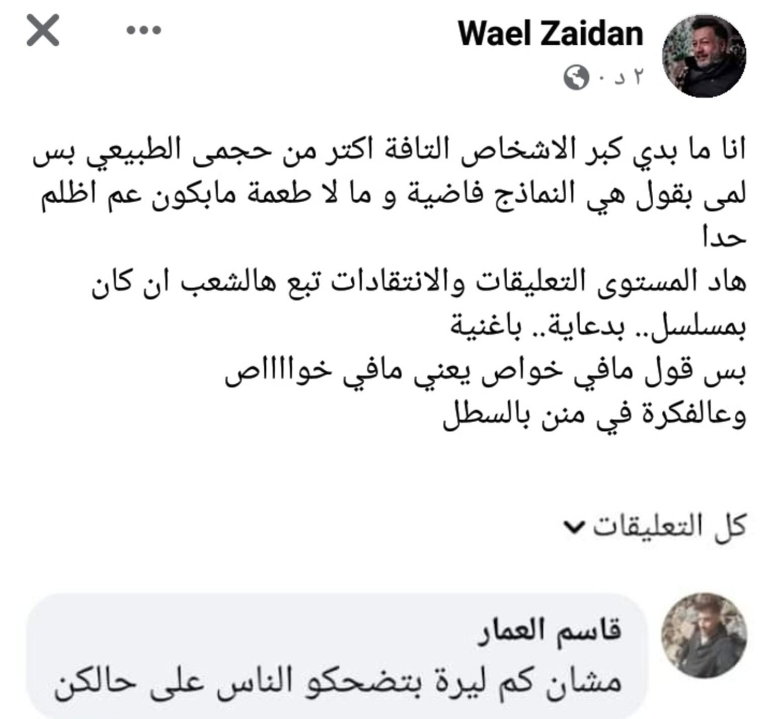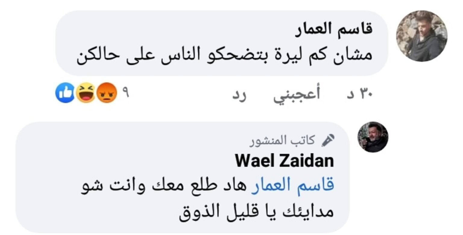 هوى الشام| خرج الممثل السوري وائل زيدان عن صمته ورد على أحد المتابعين الذين انتقد ظهوره بإعلان دعائي خاص بالبطاطا، شاتماً إياه بعبارات قاسية.