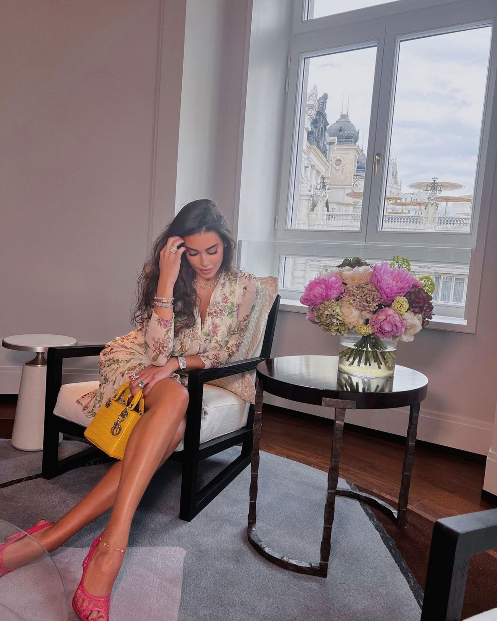 صبري زينت اطلالتها بالمجوهرات ونسقت مع ملابسها حذاء باللون الفوشيا وحقيبة يد باللون الاصفر، الصورة حازت على عدد كبير من الاعجابات وعلق عليها المتابعون متغزلين بجمال صبري ومرحبين بها في العاصمة الاسبانية.