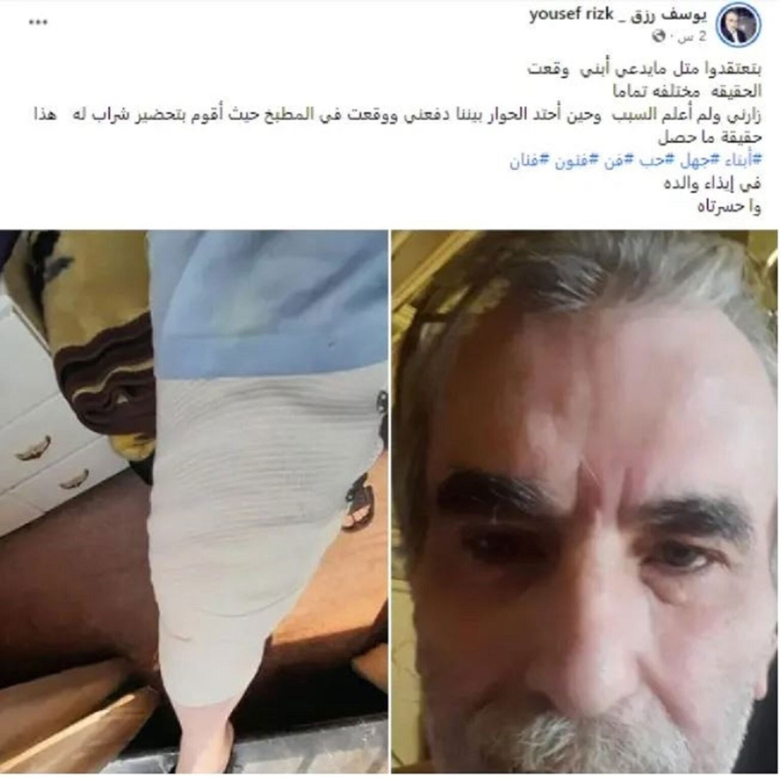 كما صدم المتابعين بنشره صور لقدمه، واتهامه إبنه بالإعتداء عليه ضرباً وإيذاءه بعد نقاش دار بينهما، وكتب: “بتعتقدوا متل مايدعي أبني وقعت.. الحقيقه مختلفه تماما.. زارني ولم أعلم السبب وحين أحتد الحوار بيننا دفعني ووقعت في المطبخ حيث أقوم بتحضير شراب له هذا حقيقة ما حصل.. في إيذاء والده.. وا حسرتاه”.