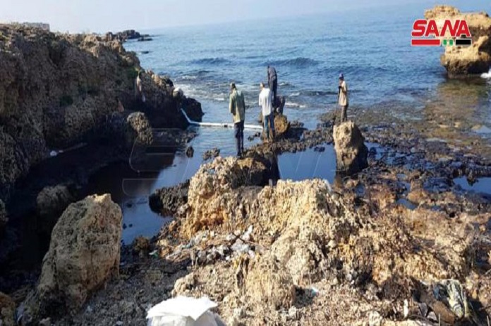 تواصل عملية تنظيف شاطئ جبلة الصخري من بقع الفيول المتسربة