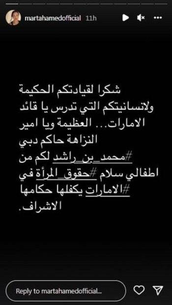 وتوّجهت مارتا حامد بالشكر إلى حاكم دبي الشيخ محمد بن راشد آل مكتوم واصفةً إياه بـ”أمير النزاهة”.
