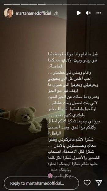 وقالت حامد عبر خاصية القصص المصوّرة الملحقة بحسابها الرسمي في تطبيق “إنستغرام”: “قبل ما انام مرتاحة في بيتي وبيت أولادي مملكتنا الخاصة، أنام وبنتي في حضني، أحب أن أطمئن كل ليحبوني ويعرفوني ويعرفوا اني ما أوقف غير مع الحق وعمري ما اسكت عن الحق للموت لإني بنت أصول وبنت عشائر ارتاحوا وطمنوا أنا بألف خير وأولادي كلهم بخير”. وأضافت: “جيراني جميعاً شكراً لأنكم أبطال لأنكم مع الحق وضد الصمت الباطل”.