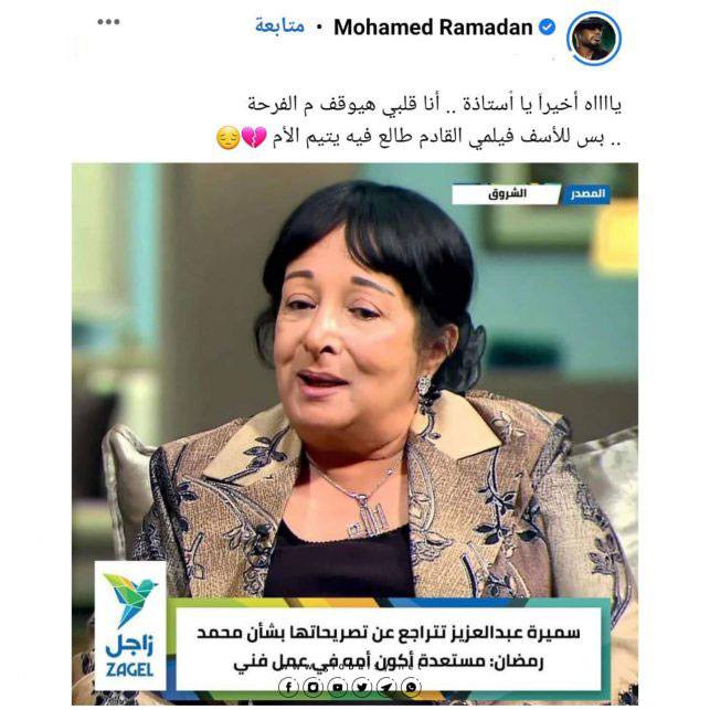 هوى الشام| أحرج النجم المصري محمد رمضان مواطنته سميرة عبد العزيز عقب تعليقه على قرار تراجعها عن موقفها منه بإعلانها استعدادها للعمل معه وتقديم دور والدته بعد أن كانت لا تقبل أن تكون والدة “بلطجي” في أي عمل فني كونها قدمت دور الأم العظيمة في أعمال فنية متنوعة.