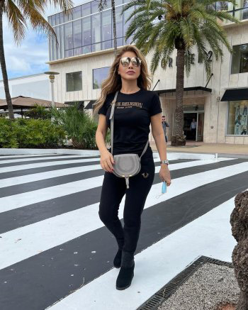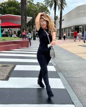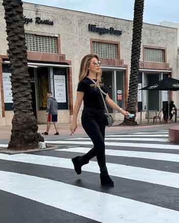 وظهرت الزغبي بإطلالة كاجوال وهي تتجول في إحدى شوارع ميامي وتستمتع بوقتها متعمدة ارتداء زي أسود كامل وكلاسيكي.